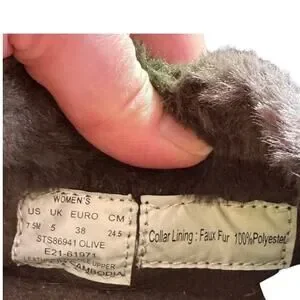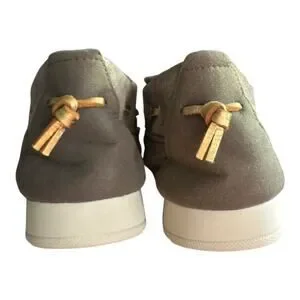 Sperry Womens Moc Sider Olive Faux Fur Lined Slip On Shoe Size 7.5 Camo Style. Shimmer on design. Gold toned tassels through sides and back. Leather and textile upper. Faux fur lining. Good, preowned condition. Some wrinkling to back heels/ankles. See picture of shoes from behind. Slip on. Padded tongue and collar. Suede and textile upper. Cushioned footbed.