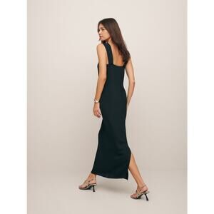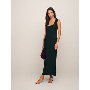 The Reformation Vea Dress is a sustainable long dress. This dress features a square neck and sleeveless straps. It is made from sustainable materials.