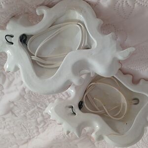 Elegant ceramic wall sconces with floral accents. Features pastel colors and intricate design.