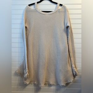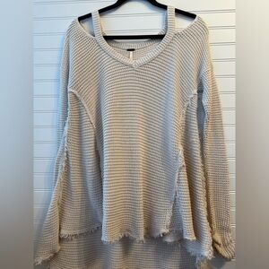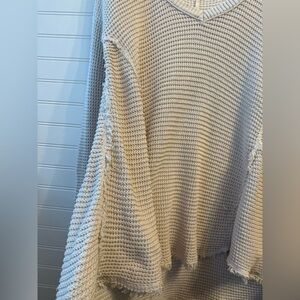 Free People knit waffle weave sweater. V-neck, off the shoulder style, intentionally frayed, very oversized and has a high low feature. The color is a tan/cream. There was a frayed hole along the seam in front that I’ve repaired (shown in picture with red circle) I almost didn’t repair it because it went with the frayed/distressed look of the sweater already😂 Sleeves are narrow but do have stretch. In good used condition.