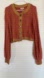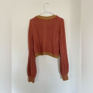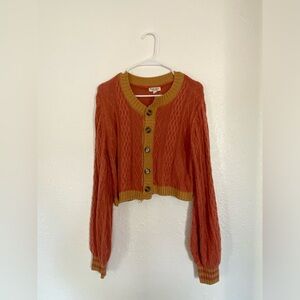 Stay cozy and stylish with this cable knit cardigan sweater. Featuring a beautiful rust color with mustard accents, this sweater is perfect for layering. Ideal for casual outings or a day at the office.