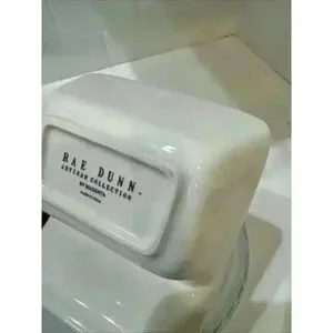 The Candy Nut Olives model is a contemporary original, produced using pottery techniques in China. It has a rectangular shape and measures 8x5 inches. The backstamp is printed and the product line is Rae Dunn. This dish is not antique, vintage, or handmade but is an original piece of art pottery.