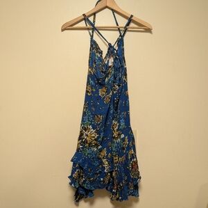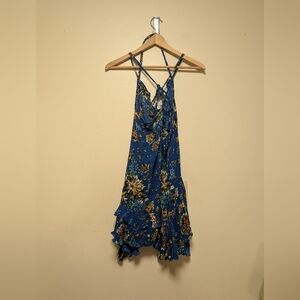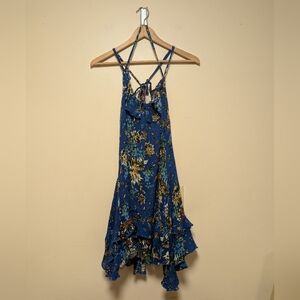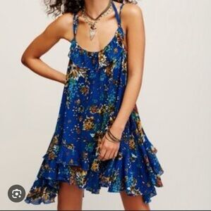 Beautiful FP One by Free People “Go Lightly” mini dress in a deep sapphire blue floral print. Features a lightweight gauze fabric with a ruffled V-neckline, tiered hem, and open strappy back with tie detail. Flowing, bohemian silhouette with a hand-touched, artisan feel — made in India. Perfect for warm weather, music festivals, or layering with boots and a jacket in cooler months.