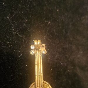 Elegant De Nicola gold tone violin brooch with intricate details. Perfect for music lovers. Measures 1.75". Missing one jewel as shown in picture.