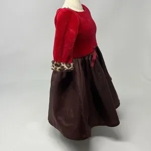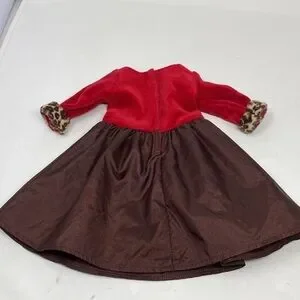American Girl Chocolate Cherry Party Dress Gown with Leopard Trim. It is in good pre-owned condition with a few spots on the brown portion of the skirt - see pictures. They are only noticeable if you really look. Review pictures please.