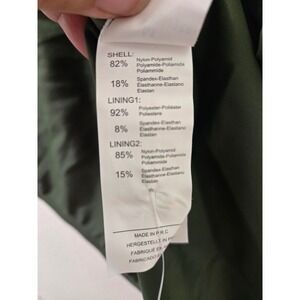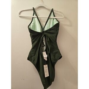 A stylish olive green one-piece swimsuit designed with tummy contouring and flattering ruching along the sides. This elegant design features adjustable spaghetti straps and a deep V-neckline, transitioning to a tie-back closure for a customizable fit. The contrasting light mint green lining adds a subtle pop of color and detail, while the hygienic liner remains intact, ensuring the item is pristine and ready for wear.
