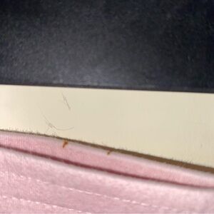 Pre-loved with some untreated spots- one near pocket and along the top of the band as shown. I took photos from both sides to show that you can see that it does show on outside in back. Very small though.
