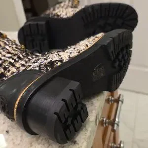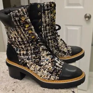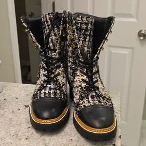 Chic lace-up boots with a tweed pattern. Features black and cream colors. Perfect for stylish outings.