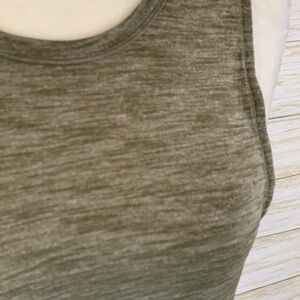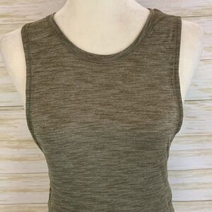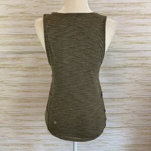 Lululemon workout top. Olive green heather stretch cotton. Side detail with crisscross bands. Size tag removed but estimate is size 2-4. Mannequin is size 2-4. Great used condition.