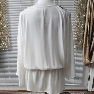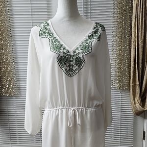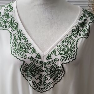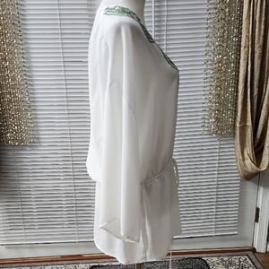 Elegant white blouse by Avenue with stylish green accents and functioning drawstring. Perfect for any occasion, NWOT, oversized, dome sleeve, ptp 25"