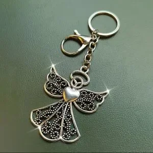 Elegant silver angel keychain, perfect for adding a touch of charm to your accessories. Ideal for gifting or personal use. This listing is for the silver color, other color shows dimensions only.