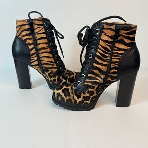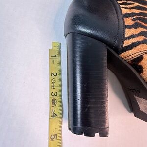 Fierce tiger print design. Bold black and tan colors. Perfect for a standout look. Comfortable and stylish. Real calf fur. 4” heel. Zipper closure.