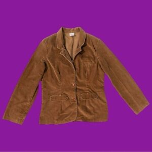 Brown corduroy blazer-style jacket with wood-toned buttons.