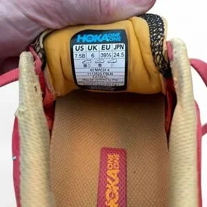The HOKA One One Mach 4 Women’s Running Training Sneaker in Red Fiesta Size 7B. Good used condition. Lots of life left in them. Look at photos to see the condition.