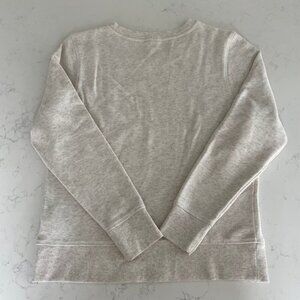 Amazon Essentials Neutral LS Crew Neck Cotton Poly Blend Sweatshirt Top w Graphics in Heather Cream + Lt. Grey Sz S - see measurements to ensure proper fit Excellent pre loved condition Features: pull on, long slv, crew neck, ribbed neck cuffs hem, black graphics on chest, light fleece lining, 60% cotton, 40% polyester, neutral, casual, cozy, comfy Approx. measurements taken laid flat: length 23.5" shoulder 16" pit to pit 19.5" pit to cuff 18.25"