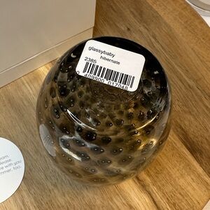 Stickered Glassybaby “hibernate” Smokey black transparent hand blown votive.