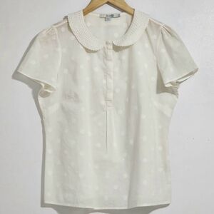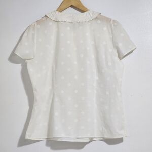 Chic white blouse with polka dots. Features a textured collar. Short sleeves for a classic look.