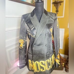 Brand new with tags, This Moschino Couture blazer is a bold and playful take on luxury fashion, blending high-end tailoring with striking graphic elements. The standout feature is the eye-catching gold zipper print, which runs across the blazer, adding a unique and edgy twist. The Moschino branding is prominently displayed, exuding a sense of high-fashion fun and exclusivity. Crafted with precision, this blazer showcases impeccable tailoring with a structured fit, making it a statement piece for anyone looking to make an unforgettable impression. It combines elegance with a touch of daring creativity, perfect for those who want to stand out in the world of couture.