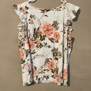 LOFT, Ann Taylor LOFT, Floral Print, Ruffle Sleeve, Cap Sleeve, Blouse, Top, Vintage Soft, Cotton, Pink, Cream, Coral, Spring, Summer, Feminine, Casual, Size L, Large