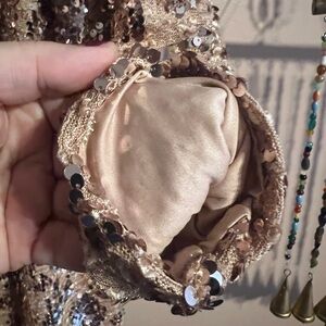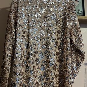 Beautiful blush dress with sequin detail. So much fun! Fully lined, very comfortable and well made. Brand new with tags. Color is best matched to the professional pictures. It looks really muted in my lighting. 39” long, 26” pit to pit