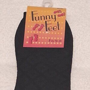 > Funny Feet: Black diamond pattern and made from 100% nylon. Machine wash warm and tumble dry. Size 9-11