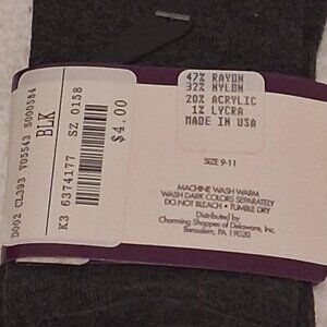 > Fashion Bug: Black and made from 47% rayon, 32% nylon, 20% acrylic, and 1% lycra. Cleaned by machine wash and tumble dry. Size 9-11. Made in the USA.