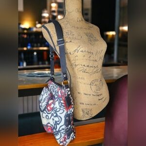This style is part of the vintage Coach Poppy collection and features a floral graffiti print in red and black on a white or cream-colored fabric with black leather trim. It has an adjustable crossbody strap and a flap closure.