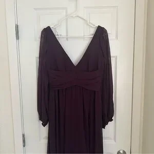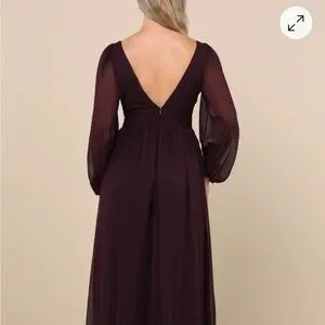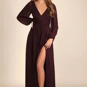 Chic plum dress with a deep V-neck. Long sleeves and flowing skirt. Ideal for elegant events.
