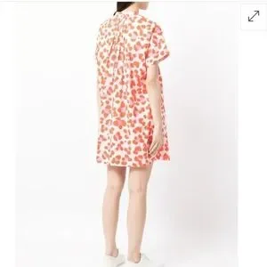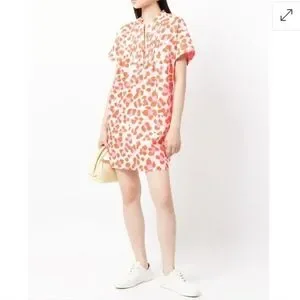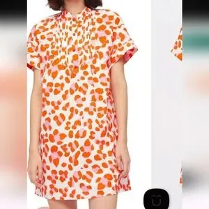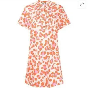 Orange cotton Fiona animal-print dress from DVF Diane von Furstenberg featuring animal print, pleat detailing, round split neck, short sleeves, and straight hem