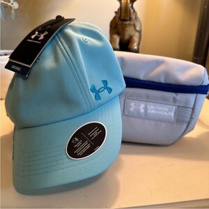 Aqua cap with Under Armour logo. Light gray pouch with blue zipper. Stylish and practical for adults