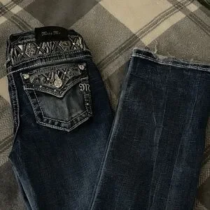 Chic dark blue boot cut jeans by Miss Me. Features intricate pocket detailing. Ideal for casual wear.