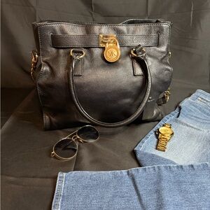 Stylish black leather tote bag with gold accents. Perfect for everyday use. Pre-loved bag♥️♥️