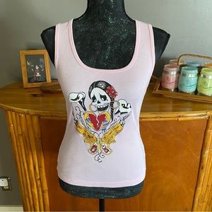 Light pink rubbed tank with graphic printed in front. Woman skull with braids and big gold hoop earrings holding a broken heart. 2 pistols under her with dice and a rose with white lilies. Her face has iridescent glitter
