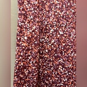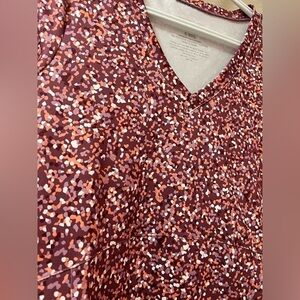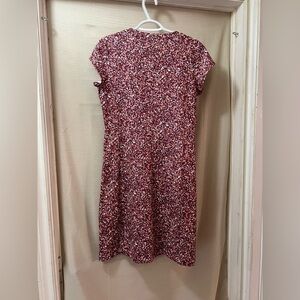 Pretty maroon and peach speckled print. V-neck, short sleeves, and knee-length. Side pockets. Soft and stretchy material. Excellent condition.