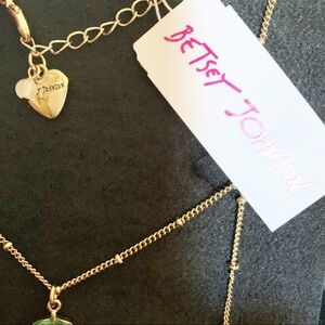 THIS IS A REALLY UNIQUE AND QUITE CLASSY CHIC SET. THE DOUBLE CHAIN NECKLACE HOLDS A CRYSTAL EMBEDDED FROG AND A LEAF AND BLUE CRYSTAL ON THE SHORTER CHAIN. THIS IS ALL ON A 20" AND 18" SHORTER ONE CHAIN AND HAS THE BETSEY JOHNSON TAG AND BJ HEART. THE FROG IS MEASURING 1" WIDE BY 1" LONG.
