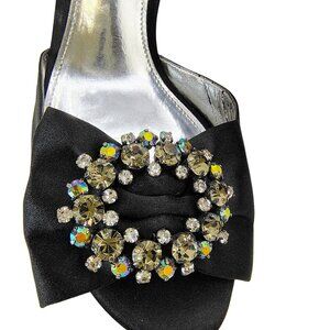 Elegant black satin heels by Nina New York featuring jeweled rhinestone accents and feminine bow detail across the toe.
