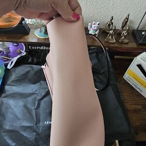 Stylish light pink tote with sleek lines. Perfect for daily essentials. Features sturdy handles.