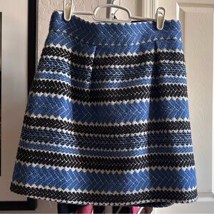 Chic A-line woven jacquard skirt with blue chevron pattern with navy lining and pockets. Adds flair to any outfit.