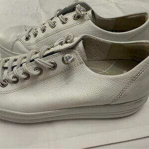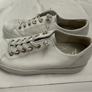 Chic and versatile white leather sneakers. Ideal for everyday wear.5.5 UK size. Pull-on style with elastic laces. All leather and insole is removable