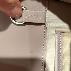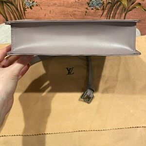 Lilac Epi leather Louis Vuitton Ramatuelle bag with brushed gunmetal hardware, tonal smooth leather trim, single flat shoulder strap, embossed logo accent at front, back exterior slit pocket, tonal canvas lining, single interior slit pocket and magnetic snap closure at front flap.
