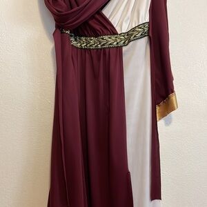 Roman empress costume by California Costumes. White and burgundy, attached cape shawl. Features gold accents and decorative trim. Perfect for themed events and Halloween. Fits like a small. Dress/shawl only, no accessories included. Will ship same day!