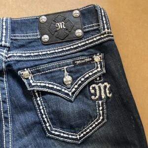 Details: Signature Miss Me thick contrast stitching, rhinestone/embellished back pockets, branded leather patch at waistband.