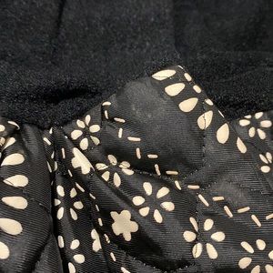 Elegant black top with a collared neckline. Flowing skirt with intricate white patterns. Perfect for a sophisticated look.