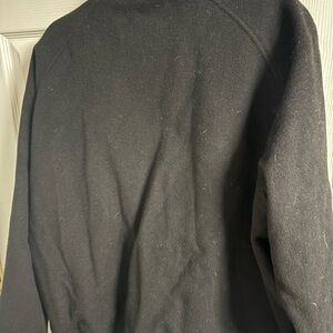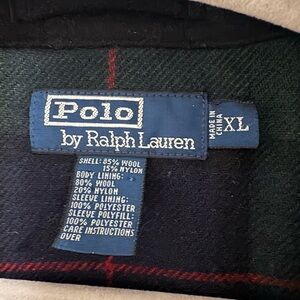 Vintage-Classic black wool bomber jacket by Ralph Lauren. Features a striking red logo. Timeless and versatile style.