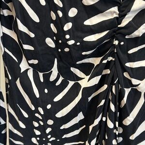 Elegant long sleeve dress. Features bold black and white pattern. Perfect for any occasion.