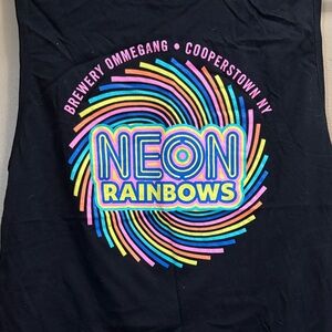 Ommegang Brewery Black tank top with colorful 'Neon Rainbows' graphic.