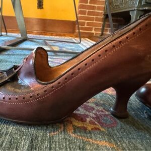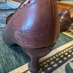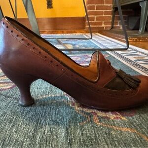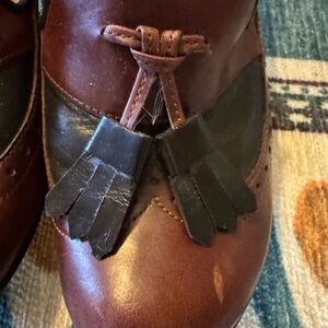 Chic John Fluevog loafers with a two-tone design. Rich brown and black leather. They are nice shoes, comfy. They’ve been worn and have a few scuffs. please check photos.