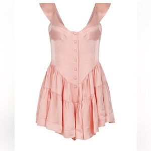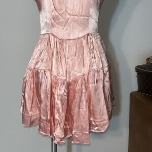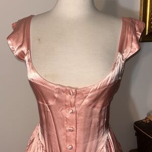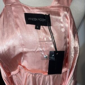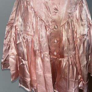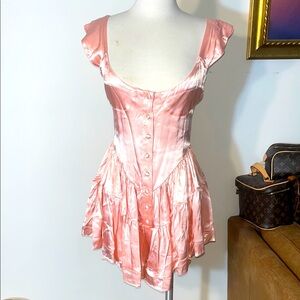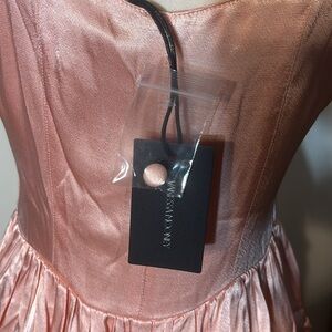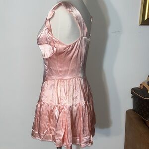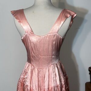 Chic pink satin dress with ruffled sleeves and skirt. Perfect for a stylish look. The Elizabeth Dress tags attached