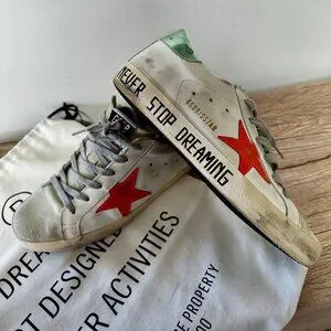These rare Golden Goose Superstar “Never Stop Dreaming” sneakers are a statement of style and optimism. Featuring the brand’s signature distressed white leather with mint and coral accents, they blend luxury craftsmanship with laid-back edge. Like new condition clean soles, pristine uppers, and ready to wear.