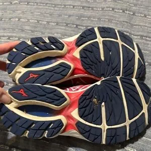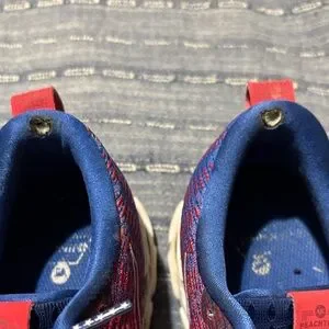 Stylish red and blue athletic shoes. Comfortable fit. Ideal for running.
